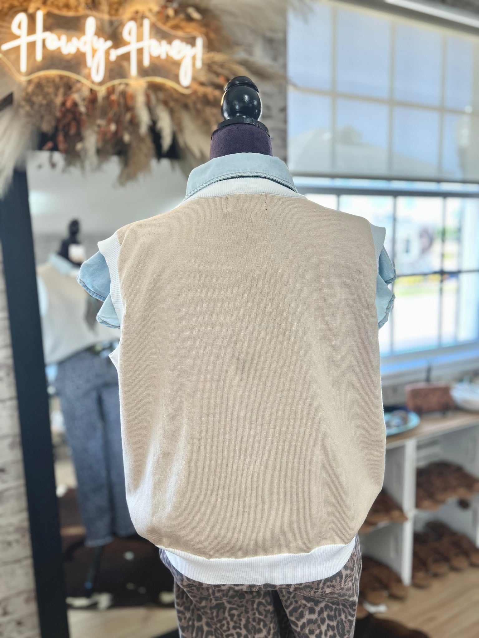 A Million Bucks Vest features a striking watercolor-style graphic of a bronc and rider across the front, capturing the spirit of the West with artistic flair. This versatile sweater vest layers beautifully over long-sleeve tees, button-ups, or lightweight sweaters, making it an essential piece for building dynamic outfits. The neutral tone keeps styling effortless while the western-inspired artwork adds character and edge to any wardrobe.