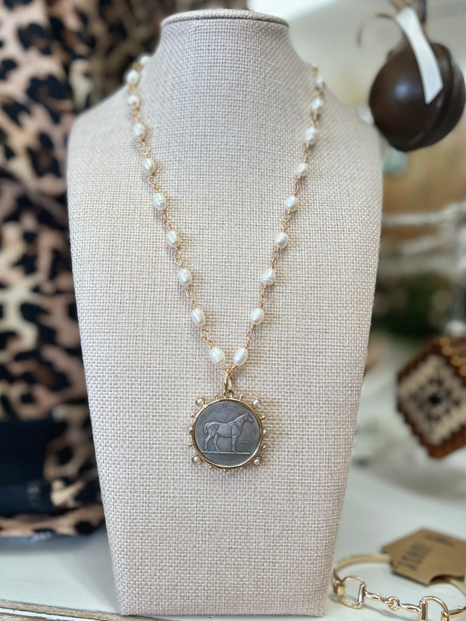 An elevated Western statement with timeless charm. This stunning 18” pearl chain features hand wire-wrapped freshwater pearls (6–7mm), each one beautifully unique. Finished with an oversized 40mm horse coin framed by a gold spiked bezel accented with delicate crystals and pearls, this piece is made to turn heads. Dressage is the kind of statement necklace that instantly pulls an outfit together — from denim and boots to dresses and date nights.