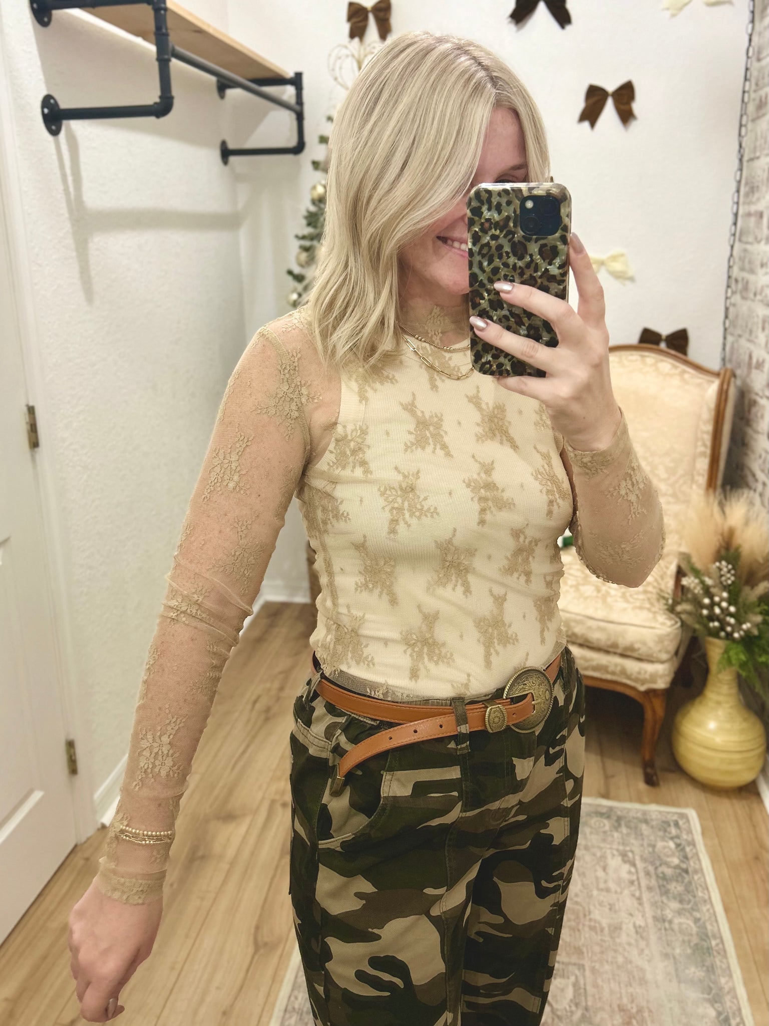 Elevate your wardrobe with this stunning Love of Lace Mesh Top in Tan. Crafted from delicate sheer lace, this slim-fitted piece offers versatile styling—wear it solo for a bold statement or layer it over your favorite basics for added dimension. The intricate lace detailing brings an effortless sophistication to any outfit. To keep your top looking pristine, hand wash and line dry. Perfect for those who appreciate timeless elegance with a modern edge.