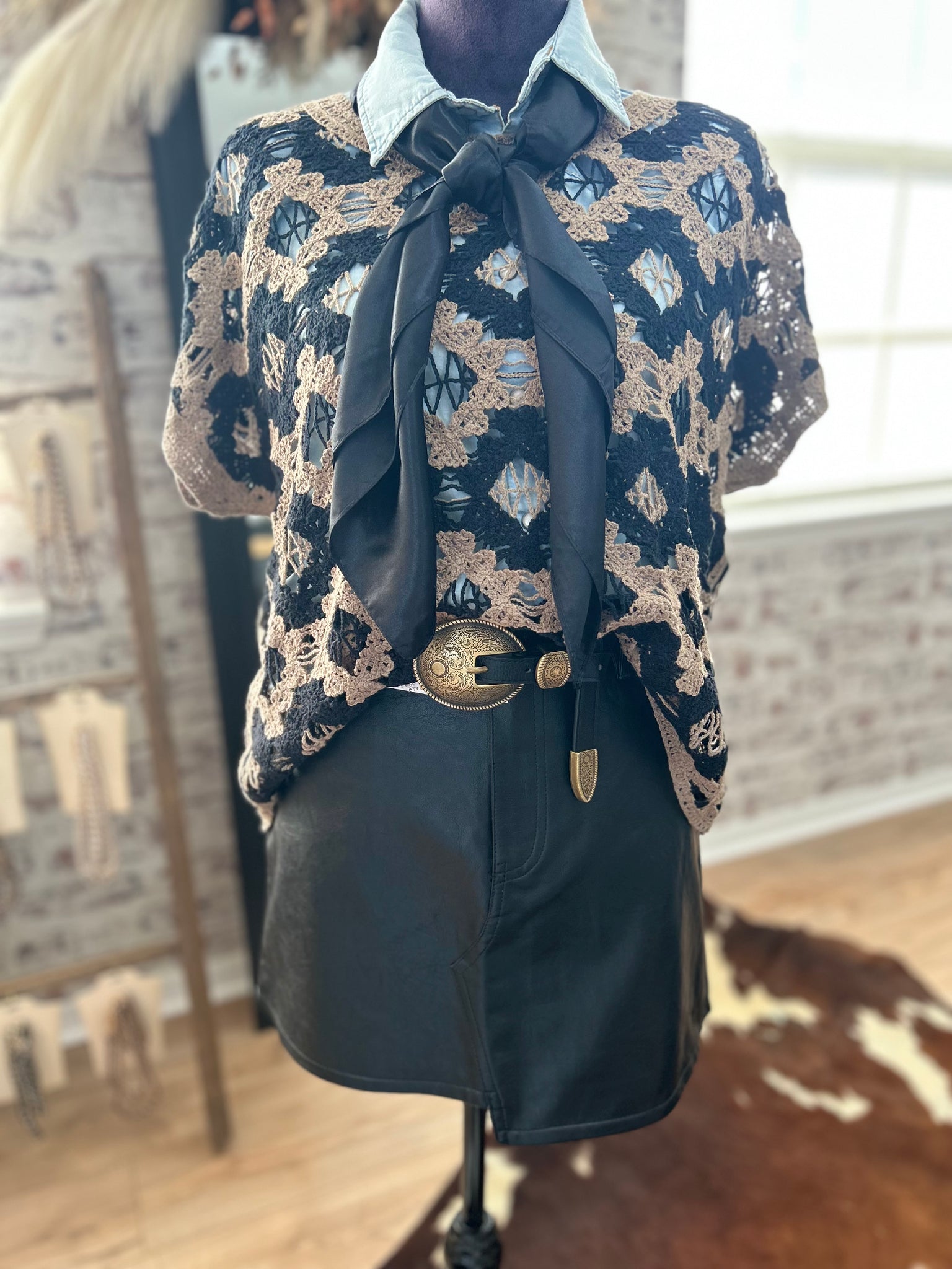 Elevate your style with the Midnight Luxe Skirt, crafted from sleek black PU leather for a bold, polished look. This mini skirt features a structured fit with a regular hem and a front zipper fly, blending edgy attitude with classic Western charm. Perfect for pairing with boots or heels, it’s your go-to piece for nights out or statement daytime looks.