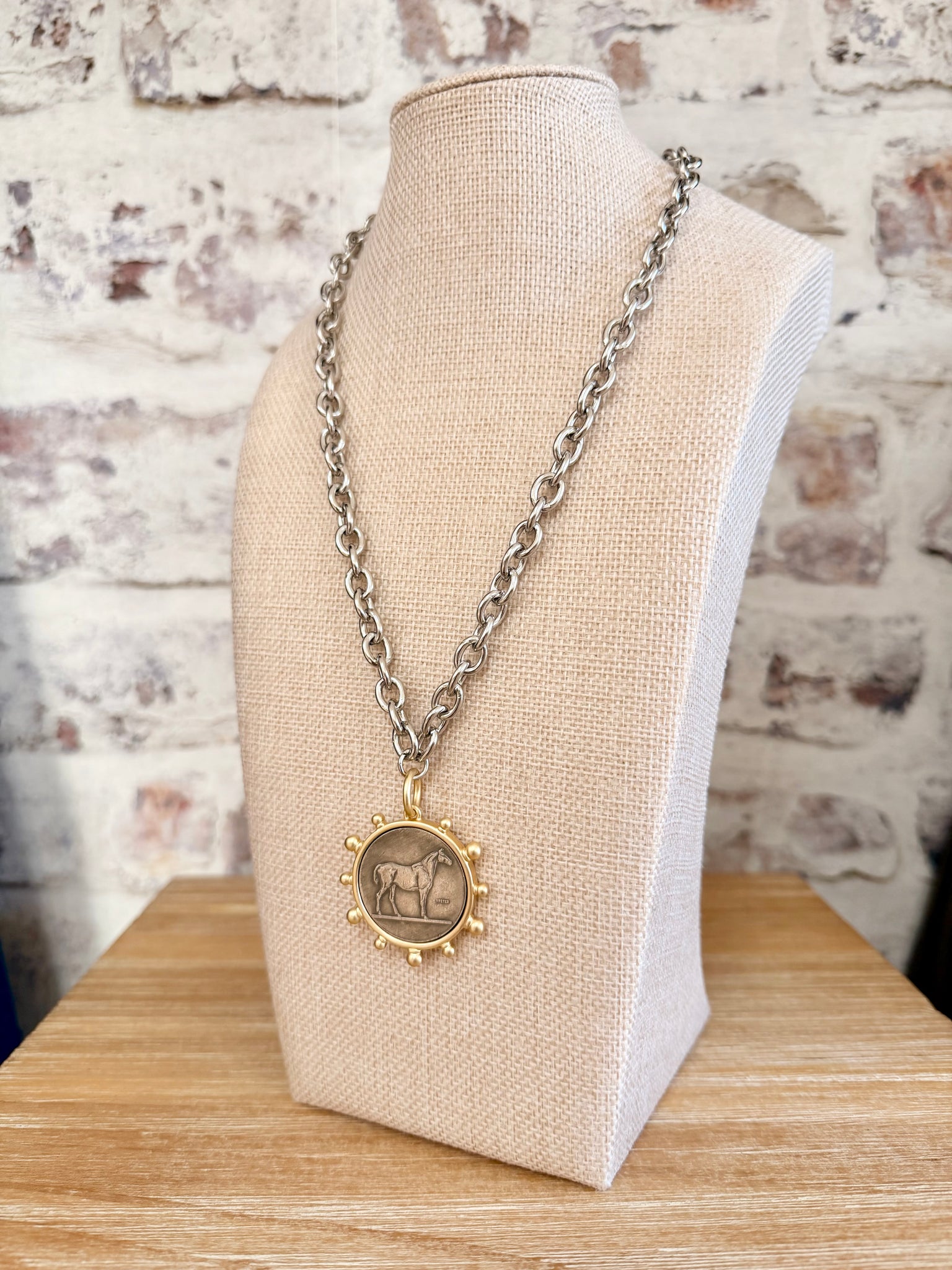 A fresh take on a Western classic. This Pony Club Necklace showcases the same iconic 40mm plated pewter horse coin framed in a soft matte gold knobbed bezel for a subtly elevated look. Paired with a silver classic stainless steel oval chain, this version adds just the right amount of contrast and polish — perfect for dressing up your everyday Western looks.