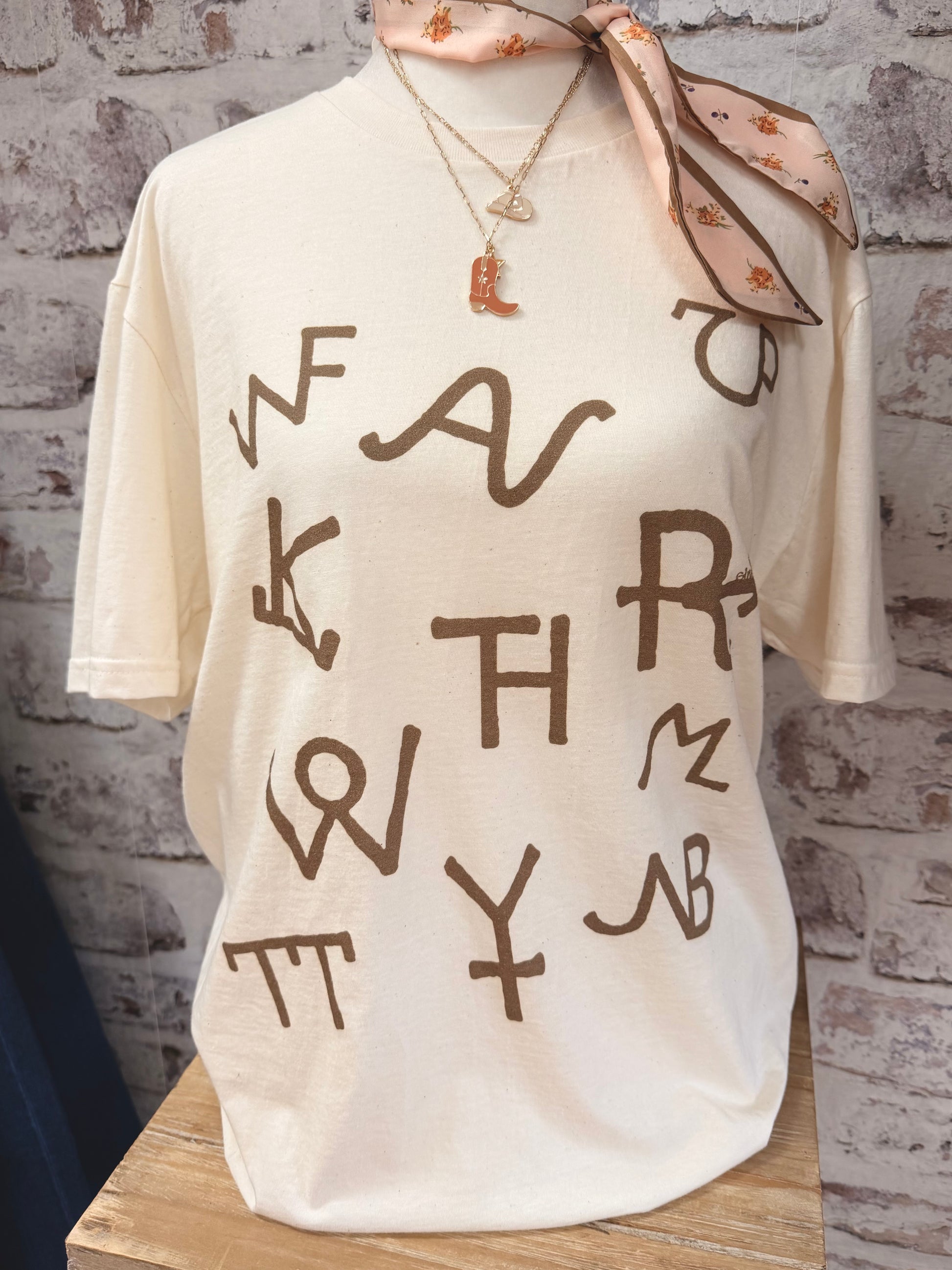 Our Ranch Brand Graphic Tee features an allover cattle-brand inspired print in a rich mocha brown on a soft cream base. It’s giving heritage ranch energy with a modern, main-street edge. The relaxed fit makes it easy to front tuck into denim, pair with cutoffs, or layer under a blazer when you’re feeling a little extra.