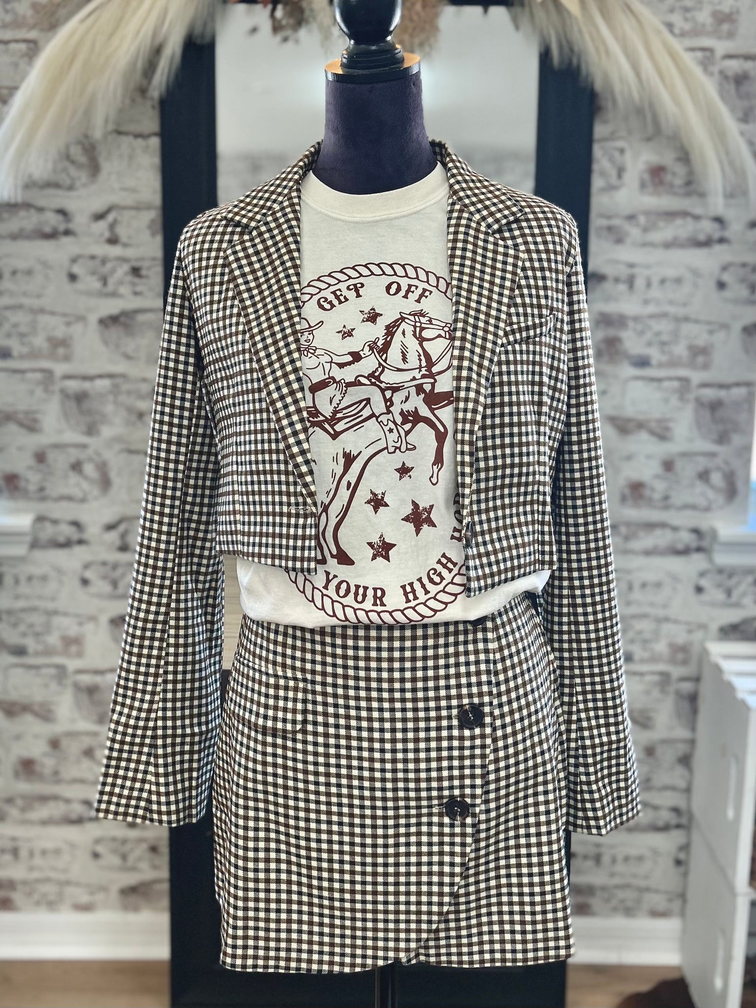 Elevate your wardrobe with this striking plaid blazer that captures effortless Western sophistication. Featuring a classic notch collar, button-front closure, and long sleeves, this cropped silhouette hits just right for layering over your favorite pieces. The bold plaid print adds character and versatility, making it perfect for dressing up denim or pairing with skirts for a polished look. A modern take on timeless tailoring with that signature Howdy, Honey! edge.