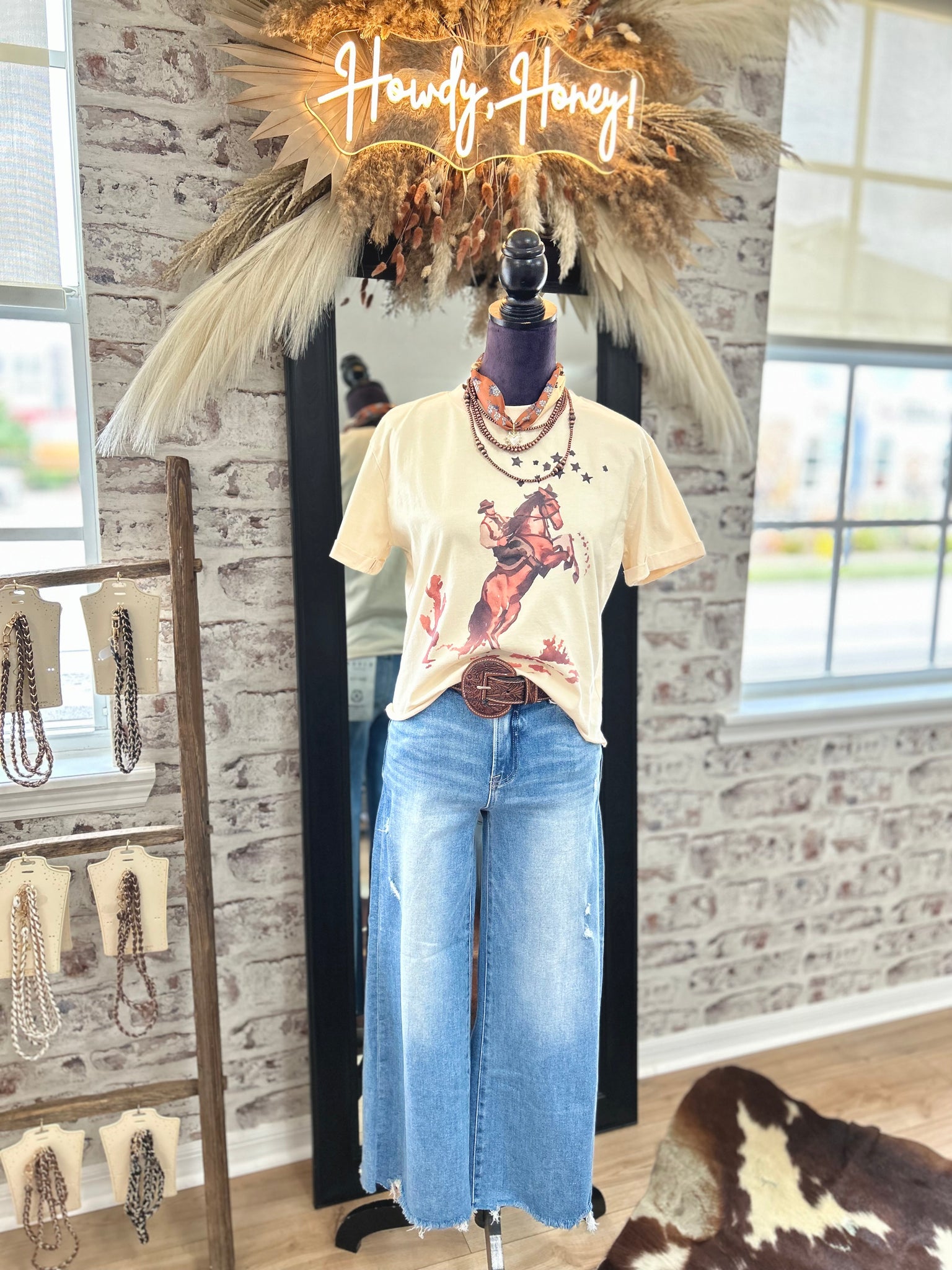 Embrace the chic Western vibe with the Starry Night Cowboy Tee. Crafted from prewashed, breathable cotton, this tee offers a soft, light feel perfect for all-day comfort. Its trendy starry cowboy print stands out against a washed fabric, while rolled cuffs, a raw hem, and ribbed neckline complete the laid-back yet stylish look.