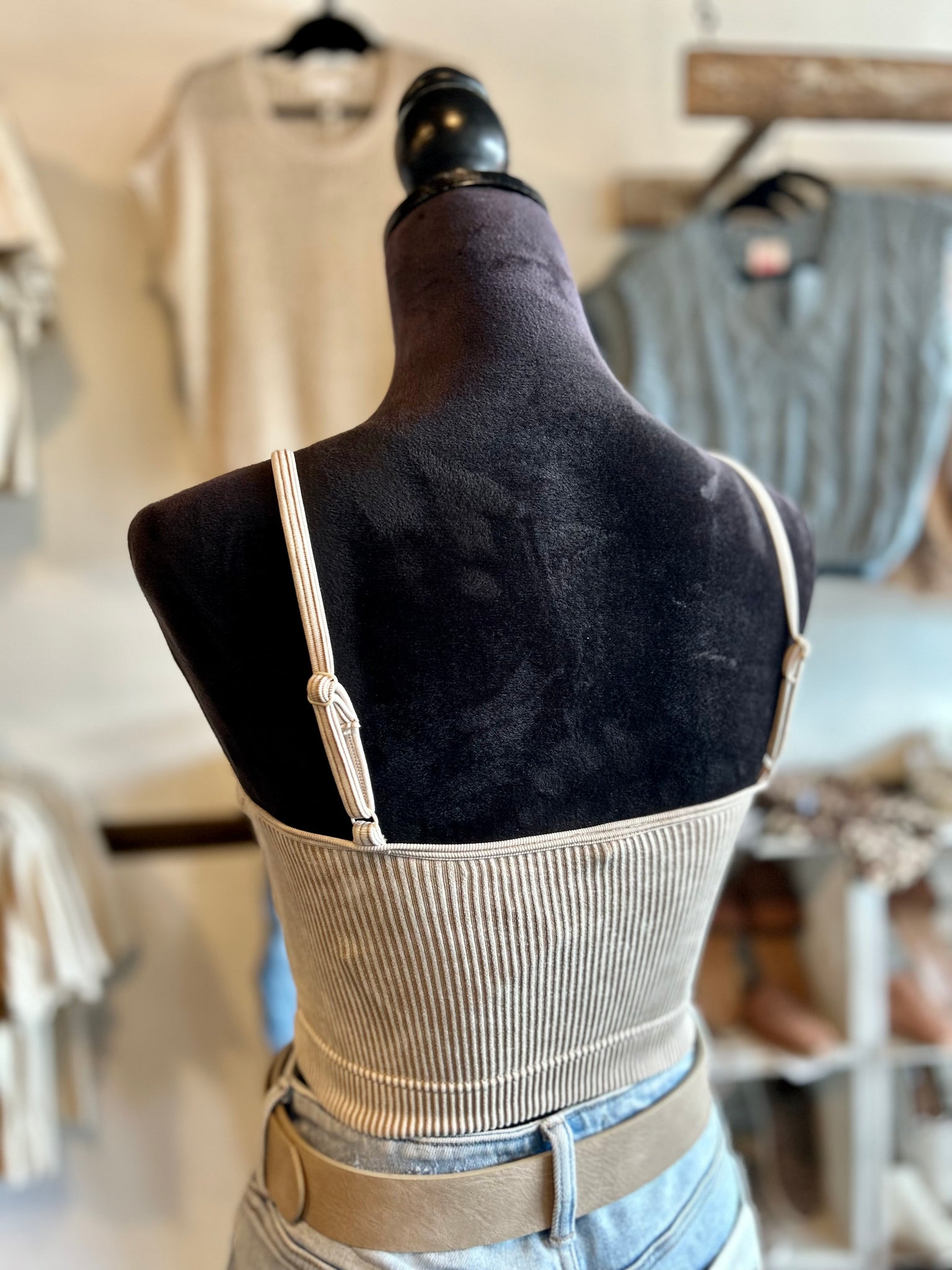 The Kira Crop Tank in Ash Mocha blends rugged charm with sleek comfort. Crafted from stone-washed ribbed fabric, this seamless tank offers a flattering fit with built-in removable bra pads for versatile support. Its cropped cut pairs perfectly with your favorite high-waisted jeans or skirts, making it a stylish staple for a chic Western-inspired wardrobe.
