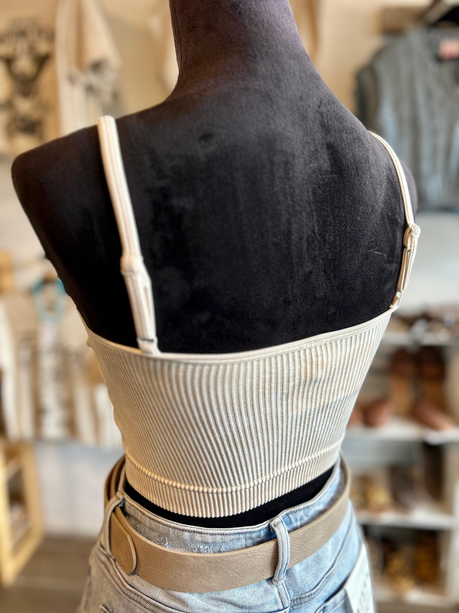 The Kira Crop Tank in Ash Mocha blends rugged charm with sleek comfort. Crafted from stone-washed ribbed fabric, this seamless tank offers a flattering fit with built-in removable bra pads for versatile support. Its cropped cut pairs perfectly with your favorite high-waisted jeans or skirts, making it a stylish staple for a chic Western-inspired wardrobe.