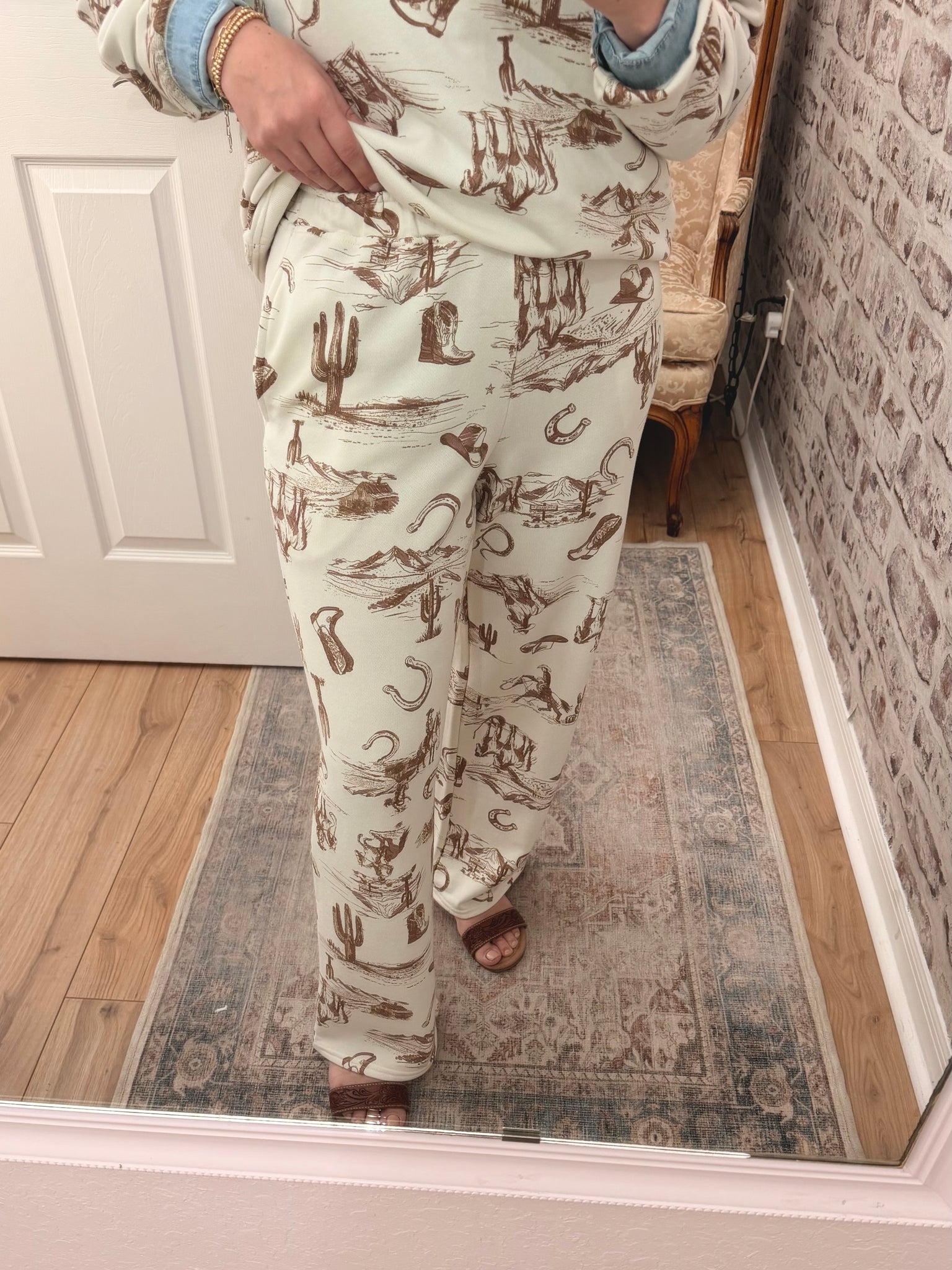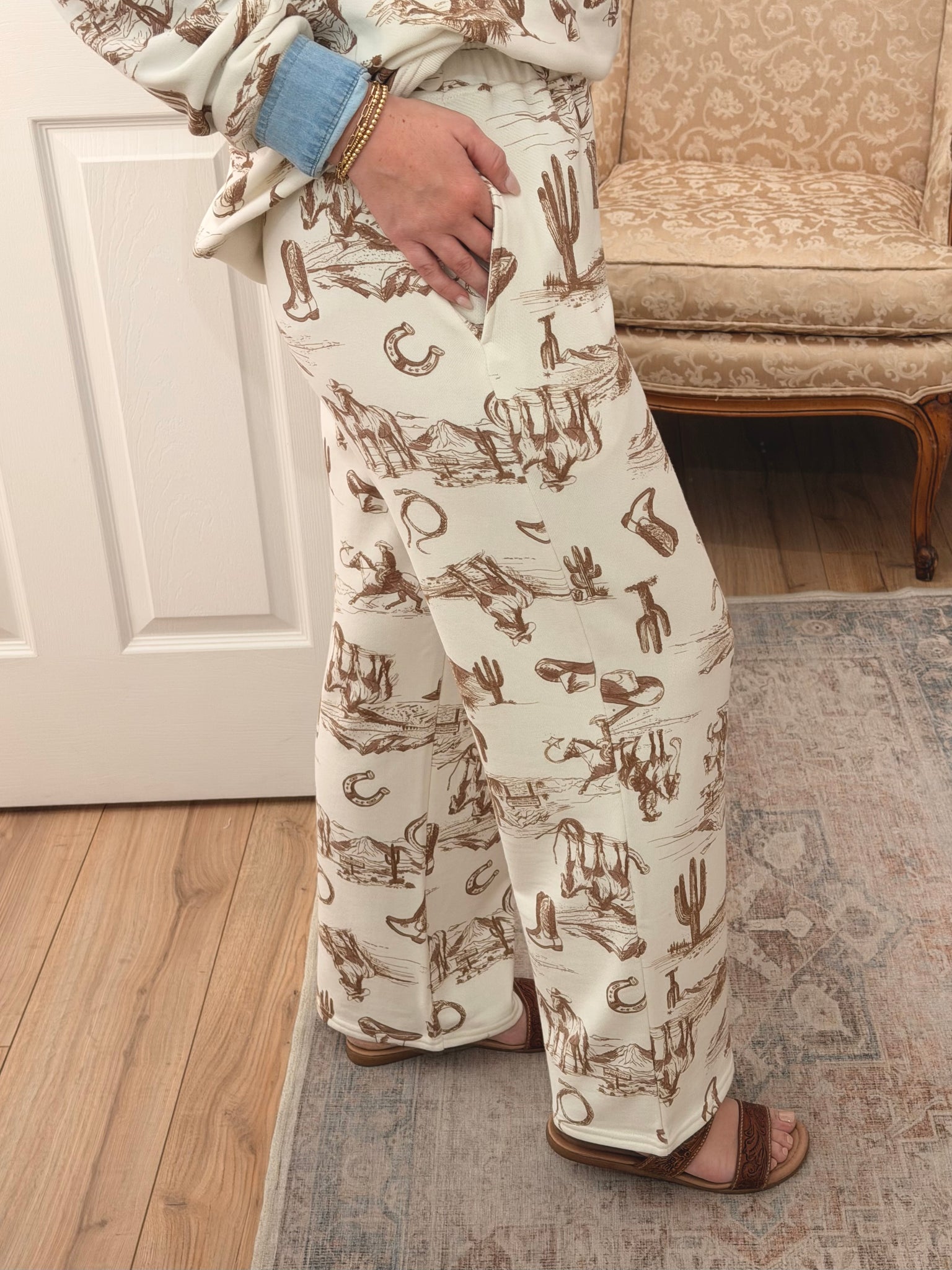 The Wide Open Spaces Jogger features an elastic waistband for enhanced comfort and a secure fit. Its jogger style, complemented by a Western print in neutral tones, offers versatility for various casual settings. This combination ensures ease of movement while maintaining a stylish appearance suitable for everyday wear.